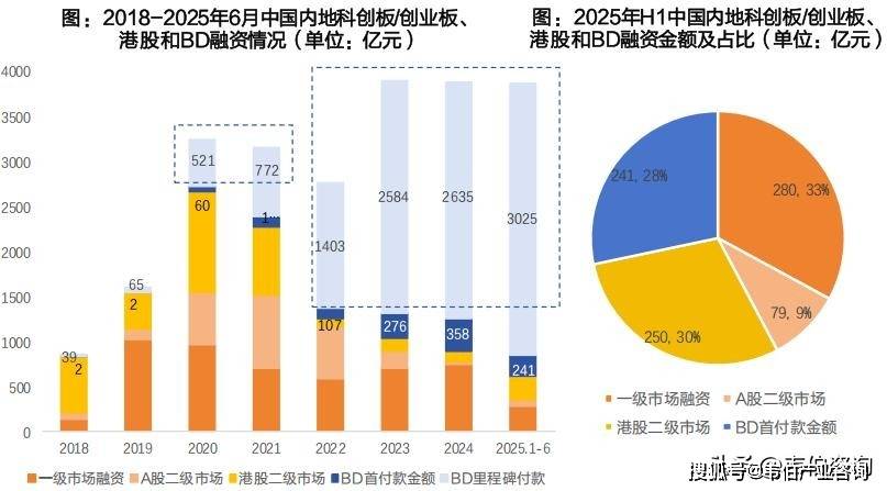 近3年,BD交易已成为创新药企业重要的收入来源。统计了2018-2025年6月的中国内地企业BD交易情况,在2025H1,BD交易首付款金额为241亿,占中国内地企业融资总额的28%。2018-2021年,一级、二级融资是创新药资金的主要来源。