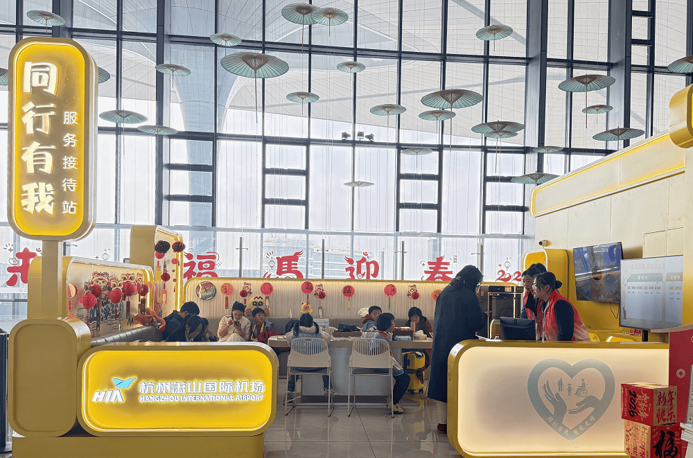 2月2日,在杭州机场航站楼内,满目装饰着中国红,各类春运活动精彩纷呈,浓墨重彩的农民画、琳琅满目的非遗展陈、欢腾的歌舞快闪,迎接着每一位远行归家的游子。在T4出发大厅,“文化暖冬行——农民画展暨新春市集”集中展示着多幅由本地艺术家创作的乡土题材书画作品,色彩浓郁、情感质朴。旅客还可以在体验区制作漆扇、漆画,沉浸式感受非遗魅力。在交通中心,由梧桐叶搭成的“翼马·云归”新年装置吸引了不少旅客驻足打卡。振翼欲飞的骏马,藏着丙午马年的祥瑞祈愿。公益摄影点则为往来旅客免费拍摄“旅途中的新年照”,定格即刻的团圆与喜悦。不远处,“马上有福”新年快闪活动轮番上演着歌舞、话剧等精彩节目。