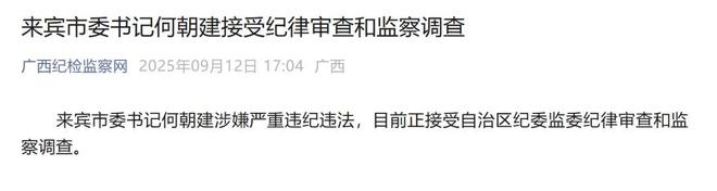 据广西壮族自治区纪委监委9月12日消息,来宾市委书记何朝建涉嫌严重违纪违法,目前正接受纪律审查和监察调查。