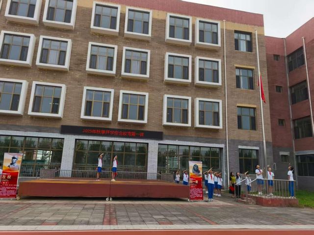 全体师生肃立注目,目光紧紧追随缓缓升起的国旗,齐声高唱国歌。飘扬的五星红旗与师生胸前的红领巾交相辉映,在秋日的阳光下格外耀眼。