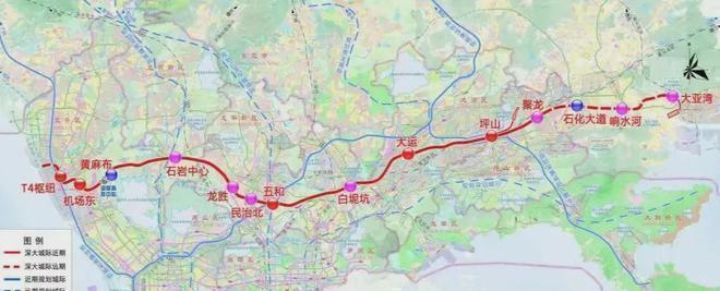 深大城际:该线年开通,起自坪山聚龙站,终至宝安T4枢纽,线km,线km/h。全线枢纽、机场东、黄麻布、石岩中心、龙胜、民治北、五和、白坭坑、大运、坪山、聚龙,预计2026年建成后,坪山至深圳机场最快仅需40分钟